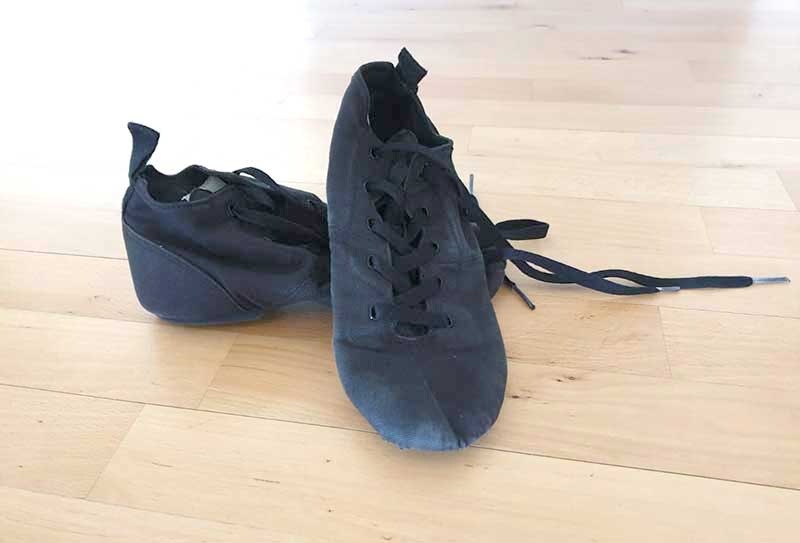 - Des chaussons noirs montants à petits talons en cuir ou en tissu (voir le modèle) :